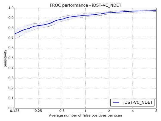 2017 年 7 月,国际权威肺结节检测大赛 LUNA16 要求选手对 888 份肺部 CT 样本进行分析,寻找其中的肺结节。样本共包含 1186 个肺结节,75% 以上为小于 10mm 的小结节。最终,阿里云 ET 在 7 个不同误报率下发现的肺结节平均召回率达到 89.7%。(召回率指在样本数据中成功发现的结节占比,下图显示了 ET 在不同误报次数下的召回率情况。)