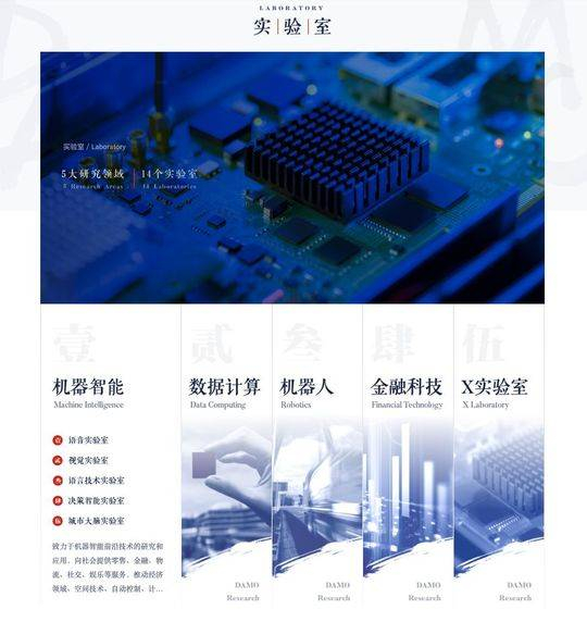 2017 年 10 月的杭州云栖大会上,阿里巴巴正式宣布成立达摩院,未来三年将投入将超过 1000 亿人民币用于基础科学和颠覆式技术创新研究。达摩院官网正式上线后,我们看到达摩院重点布局机器智能、数据计算、机器人、金融科技以及X实验室五大领域,相应设置有 14 个实验室,共有近 70 名海内外专家坐镇。