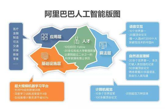 阿里拥有全面的 AI 技术布局,涵盖语音智能、语言技术、机器视觉、决策智能等方向,建成了完善的机器智能算法体系, 不仅囊括语音、视觉、自然语言理解、无人驾驶等技术应用领域,还不断深化AI基础设施建设,重金投入研发AI芯片、超大规模机器学习平台,并建成了单日数据处理量突破 600PB 的超大计算平台。