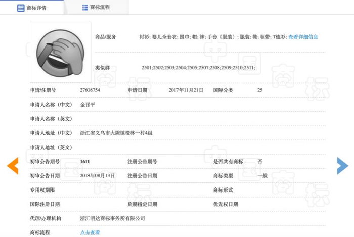 去年9月,有人发现这个“捂脸”表情竟然被抢注为商标了。中国商标网信息显示,该商标的申请人名叫金召平。商标的核定使用商品/服务项目为第25类,涵盖服装、婴儿全套衣、鞋帽袜、领带围巾等。