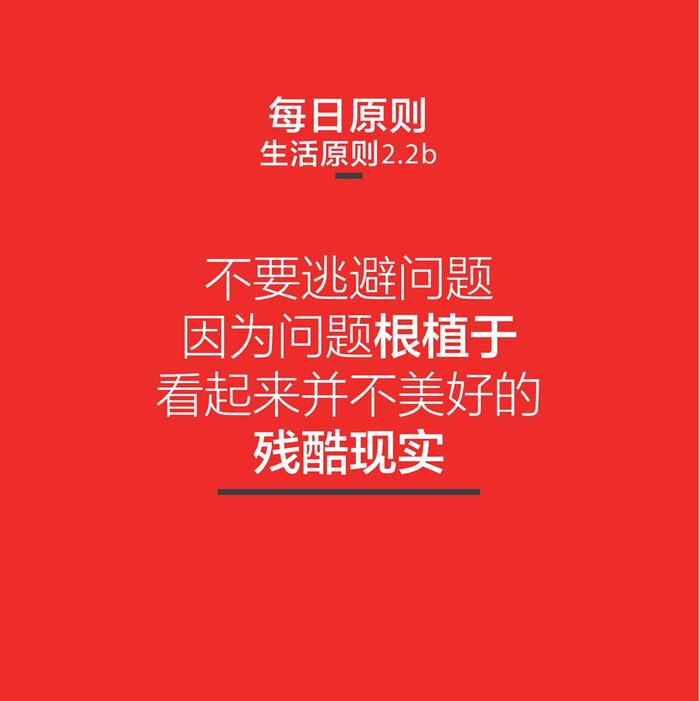 人避免不了痛苦,尤其是在追求雄心勃勃的目标时。不管你相信与否,如果以正确的态度对待痛苦,感到痛苦就是你的幸运,因为这是一个信号——你需要寻找解决方案以便继续前进。如果你能形成一种条件反射,面对精神痛苦时能够自动地反思痛苦,而不是躲避痛苦,你就能够快速地学习和进化。直面那些由问题、错误和弱点导致的痛苦现实,会大幅提高你的效率,我相信,只要你看到了这种做法的好处,就不会再想以其它方式行事了。你只需要养成这样做的习惯。