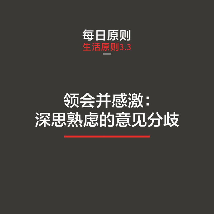 当两人的观点截然相反时,很可能有一个人是错的。搞明白是不是你错了很有价值。所以我认为,你必须领会深思熟虑的分歧当中的艺术。在深思熟虑的意见分歧中,你的目标不是说服你是对的,而是弄明白谁是对的,并决定该怎么做。双方的动力都是对错过重要观点的担忧。你们彼此要真正看到对方看到的东西,也就是说,你们两人“更高层次的我”努力探寻事实,这样的交流使双方受益匪浅,并能释放出巨大的未被发掘的潜力。