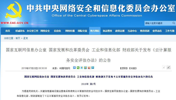 据国家互联网信息办公室官网7月22日消息,为提高党政机关、关键信息基础设施运营者采购使用云计算服务的安全可控水平,国家互联网信息办公室、国家发展和改革委员会、工业和信息化部、财政部制定了《云计算服务安全评估办法》,现予以发布。自2019年9月1日起施行。