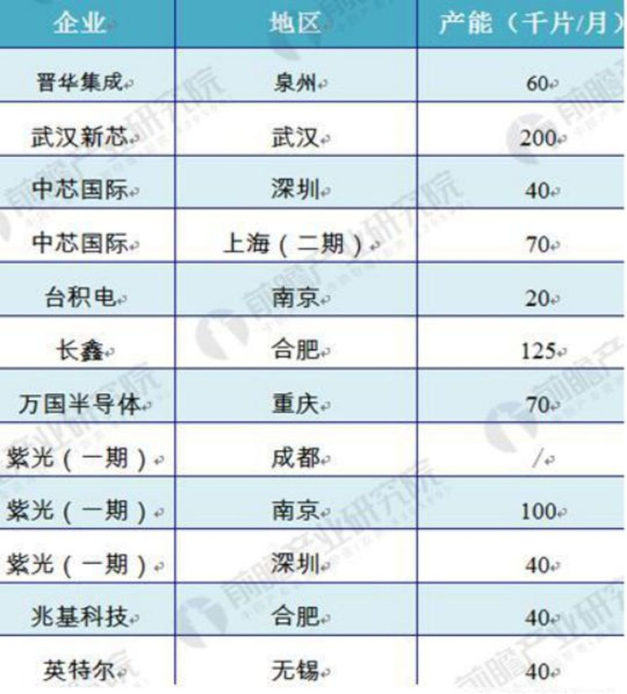 2018年投产12寸晶圆厂汇总(单位:千片/月)