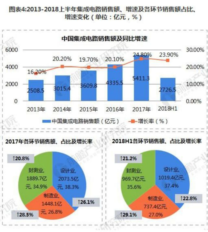 2018年上半年,中国集成电路产业销售额达2726.5亿元,同比增长23.9%,设计、制造、封测三大环节比例格局基本保持一致。其中,设计业同比增长22.8%,销售额为1019.4亿元;制造业继续保持高速增长态势,同比增长29.1%,销售额为737.4亿元;封装测试业销售额969.7亿元,同比增长21.2%。