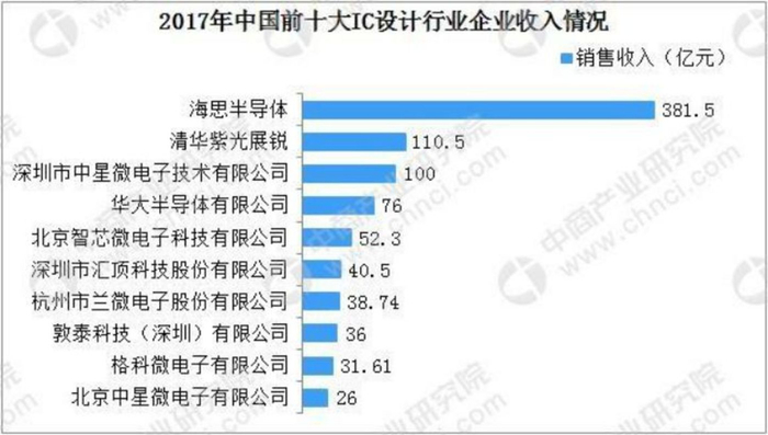 2009年,我国只有1家IC设计企业进入全球前50名,而在2017年达到了10家。2017年,国内前十大IC设计企业的销售收入为893.15亿元,占国内IC设计行业市场份额的比重为43.07%。