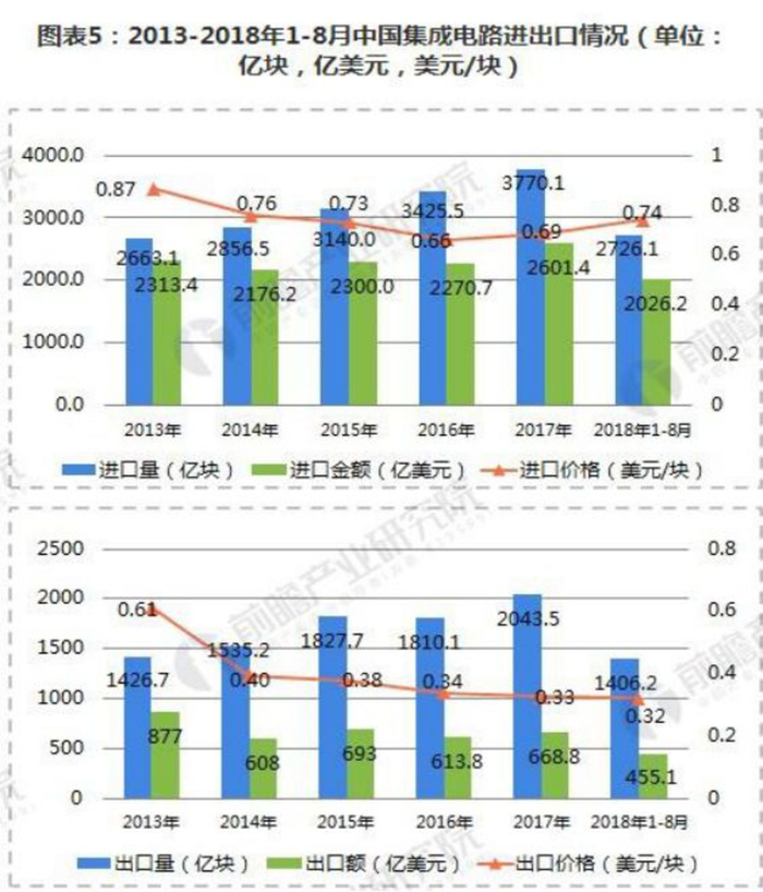 出口方面,2018年1-8月,我国集成电路出口量为1406.2亿块,同比增长7.5%;出口金额共455.1亿美元,同比增长10.9%;出口价格延续下降趋势,降至0.32美元/块。
