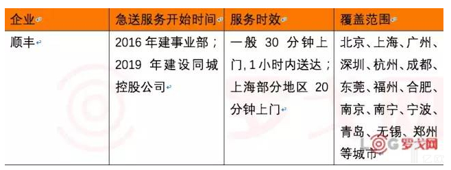 2016年,顺丰成立同城事业部,同年推出即刻送;2017年顺丰专送上线;2018年7月,正式推出同城急送业务,在北上广深杭五城同步上线。