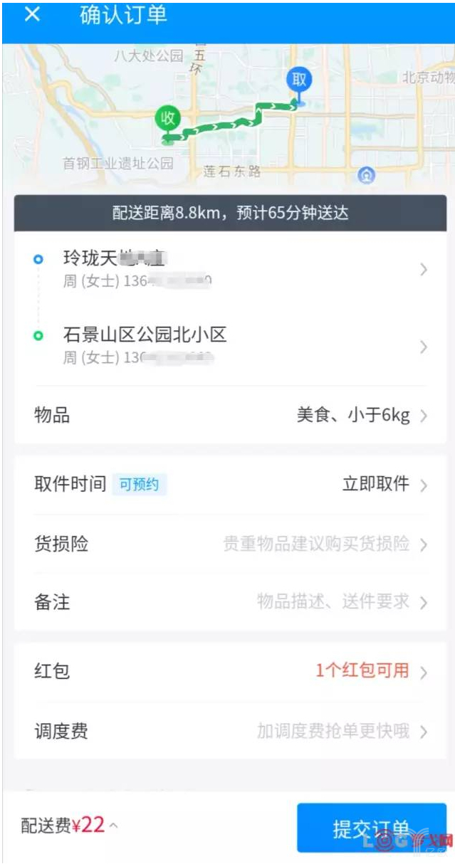 蜂鸟即配则是显示8.8公里,上门取件时间+配送时间总共预计65分钟,不要优惠前提下,价格也是最优惠的22元。