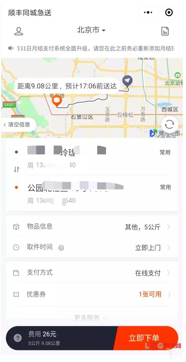 顺丰同城配送显示距离9.08公里,预计配送时间在96分钟(包括上门取件、送达),不要优惠前提下价格为26元。