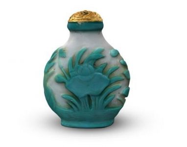 故宫藏乾隆款白色地套豆绿色玻璃花卉纹鼻烟壶。