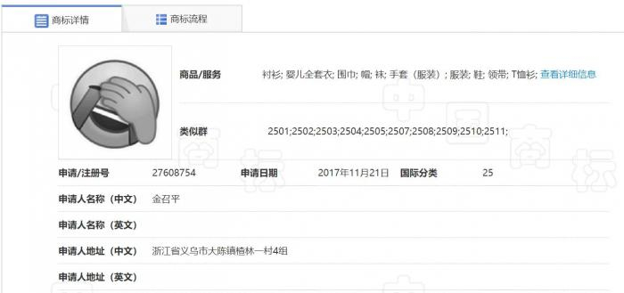 但简单、生动的聊天表情被大量滥用的情况不止这一例。去年9月,“捂脸”表情被申请注册商标。中国商标网信息显示,该商标的申请人名叫金召平。商标的核定使用商品/服务项目为第25类,涵盖服装、婴儿全套衣、鞋帽袜、领带围巾等。