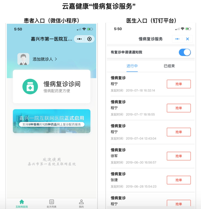 以云嘉健康的“慢病复诊”应用为例,业务需要连接医院、医生以及患者三方。嘉兴市第一、第二医院的病人如果要做慢病复诊,微信上使用“慢病复诊”小程序,只要点两步就完成了,医生在钉钉中会实时收到一个消息,提示病人要进行慢病复诊,医生可以抢单,在钉钉上进行处理、转方或者直接给患者打电话。