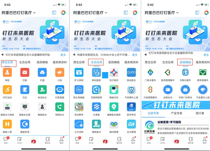 钉钉医疗应用(从左到右依次是其原生应用、生态应用、医院模版),根据不同医院的需求,该应用界面会有所不同,钛媒体付梦雯制图