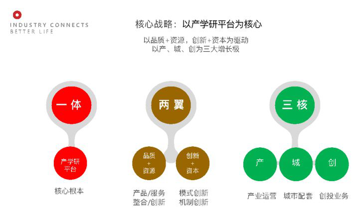 “产学研”内在逻辑是:一方面,从科研的角度出发,将研究机构、智库的力量应用到行业升级当中;另一方面,聚合各产业板块之间产学研的资源,做好科创服务。其中,产是大脑与核心驱动,学是北大资源可聚集的顶级学术智库资源,研则是顶层设计。在这些不同资源的互动中,北大资源其实扮演的是一种连接平台的作用:将市场与高端科研和智库资源互相打通,再通过系统化的产品体系,为产城融合以及未来城市的落地提供多种业态的服务。这种“产学研”模式赋予了北大资源特有的以科创为核心的企业驱动力。