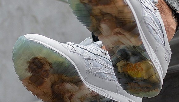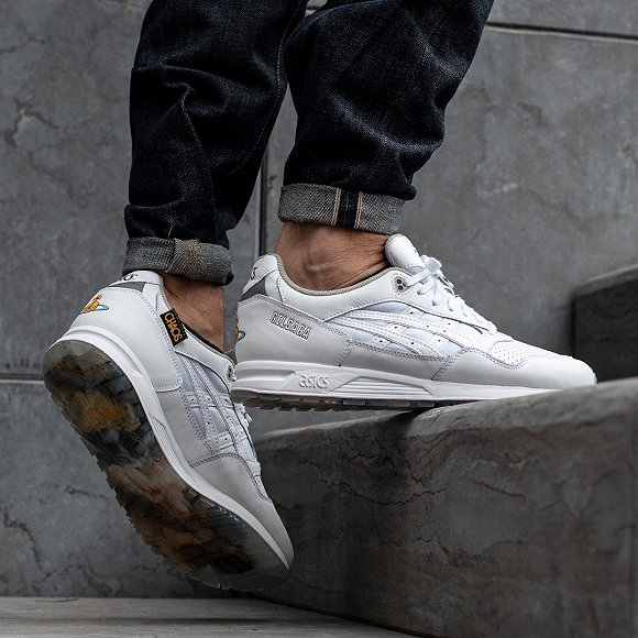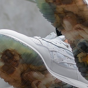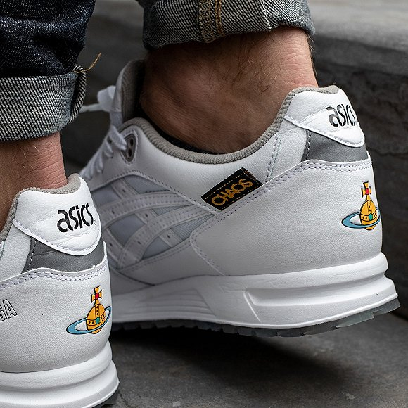此次联名的鞋履造型基本延续了GEL-Saga款式的轮廓,鞋面外侧的条纹装饰Asics最就有代表的设计标志之一。但相比起常规款式,Vivienne Westwood这次专门在鞋帮制作上选用牛奶白色皮革进行设计,触感和视觉感上都更为细腻。
