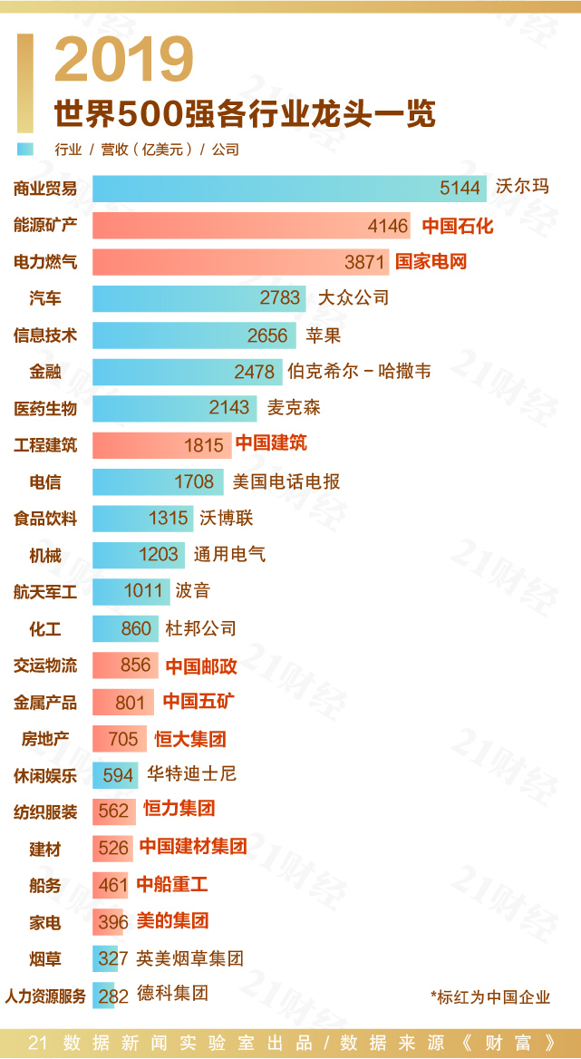 据21数据新闻实验室统计处理2019年世界500强公司分布行业发现,23个行业龙头中国公司有10家,占比近半,多为能源电力、工程建筑、金属产品、房地产等行业。