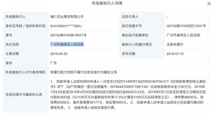 记者通过天眼查了解到,辅仁集团因有履行能力而拒不履行生效法律文书确定义务,在今年5月10日、7月12日,先后被上海市浦东新区人民法院、广州市越秀区人民法院列为失信被执行人。