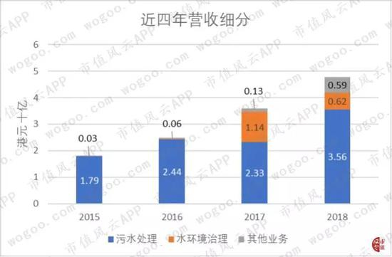 2017年之前污水处理占公司营收的比重达到98%以上。从2017年开始,公司新增水环境治理业务,并对收入进行了更细致的划分。