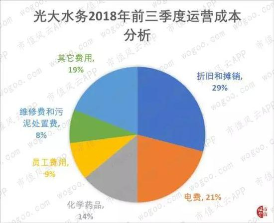 2018年前三季度,光大水务污水处理的运营成本主要为折旧和摊销、水电费、污水处理用化学药品,分别占到运营成本的29%、21%和14%。