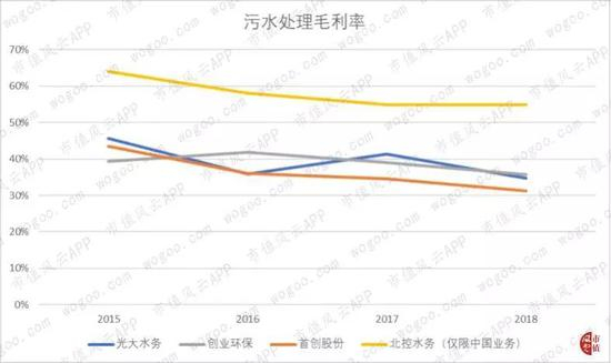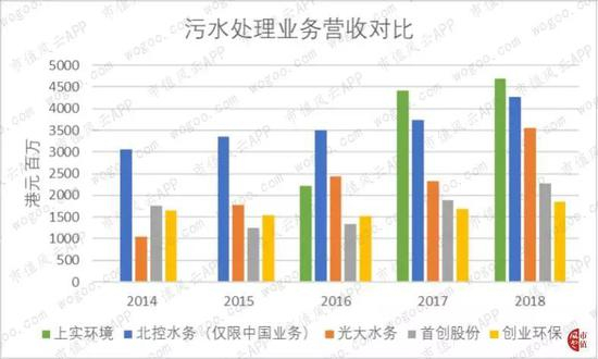 2018年,上实环境、北控水务、光大水务、首创股份和创业环保的污水处理业务收入依次为46.9亿、42.7亿、35.6亿、22.8亿和18.6亿港元。