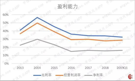 公司盈利能力从2016年开始逐渐稳定。其中2018年的毛利率、经营利润率和净利率分别为34%、28%和15%。