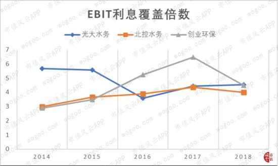 2018年,光大水务的EBIT利息覆盖倍数为4.55,与创业环保差别不大,略高于北控水务的4.0。
