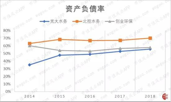 另外,光大水务近五年来资产负债率呈上升趋势,不过仍然低于北控水务和创业环保。2018年光大水务、北控水务和创业环保的资产负债率分别为56%、70%和58%。