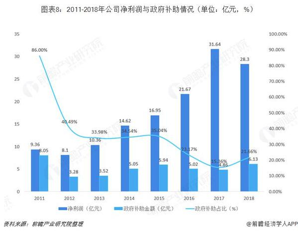 公司盈利能力逐渐上升,归属于母公司股东的净利润从2009年的1.8亿元上升至2018年的28.3亿元,年均复合增长率达到35.81%。中国LED行业发展初期,为大力发展LED产业,中央及个地方政府给予相关LED企业很大的扶持力度。三安光电早期依赖政府补助,自身盈利能力有限,随着公司规模的不断扩张和自身研发能力的提升,公司逐渐摆脱对政府补助的依赖,逐步实现自主盈利。2018年,公司归母净利润为28.3亿元,较上年下降10.56%,其中政府补助金额6.13亿元,政府补助占当期利润占比下降至21.66%。