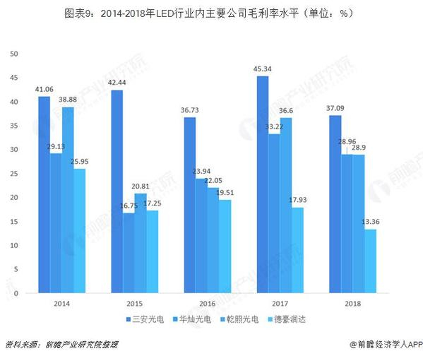LED外延片及芯片,原材料是外延片最主要的生产成本,主要包括衬底、MO源、特殊气体等。芯片产品原材料也是芯片最主要的生产成本,主要包括外延片、贵金属等。三安光电生产芯片所用外延片主要为安徽三安、天津三安和厦门三安科技生产,外延片为半成品,公司自用生产LED芯片可以大幅减少公司中间成本,导致公司毛利率水平高于同行业竞争对手。2018年,三安光电LED产品毛利率水平为37.09%,远高于行业内其他公司。