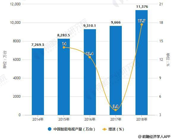 在光纤普及,网速提升以及互联网电视盒子的刺激下,我国智能电视市场迎来了快速发展。据前瞻产业研究院发布的《中国智能电视行业市场前景预测与投资战略规划分析报告》统计数据显示,2014年中国智能电视产量已达7269.3万台,2016年我国智能电视产量达到9310.1万台,增长率达12.39%。到了2017年相对彩电产量1.6%的增速,中国智能电视产量延续了增长势头,2017年中国智能电视产量增长至9666万台,同比增长3.8%。截止至2018年底,中国智能电视产量突破了一亿台,达到了11376万台,同比增长17.7%。