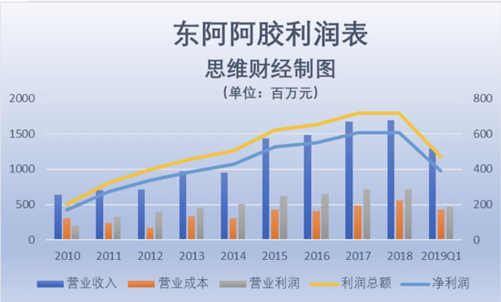 值得一提的是,早在2016年东阿阿胶业绩便开始显露疲态。财报显示, 2015年-2018年东阿阿胶营收增幅分别为35.94%、15.91%、16.70%、-0.46%,四年里东阿阿胶净利润增速分别为19%、14%、10.36%、1.98%,营收和净利润自2016年开始放缓,截至到今年一季度,两项指标均呈负增长,而这也是东阿阿胶自2006年以来首次出现负增长。