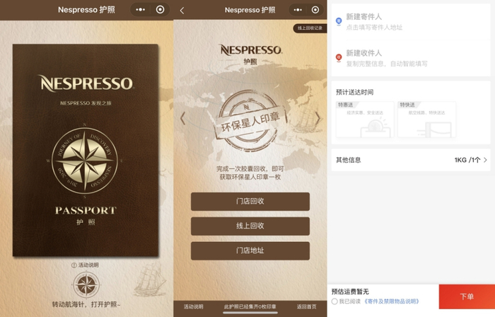 在Nespresso护照小程序上的环保星人印章里点击线上回收,也可直接跳到快递页面。
