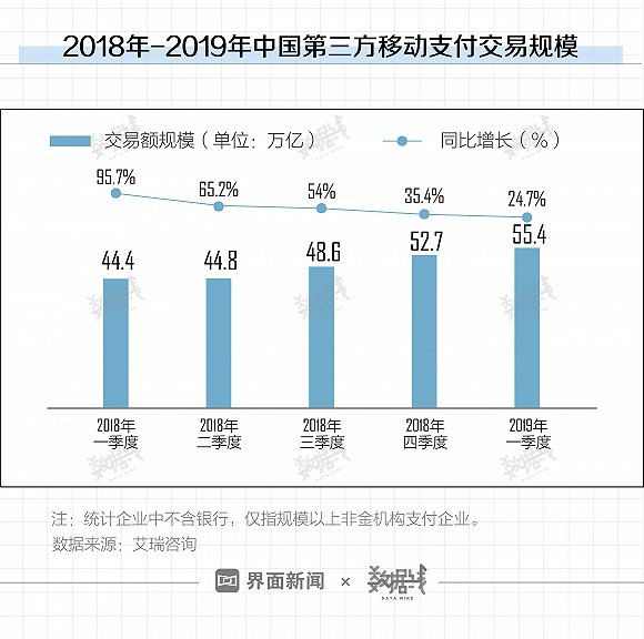 据艾瑞咨询数据,2019年一季度中国第三方移动支付交易规模达55.4万亿,同比增速为24.7%。2018年一季度以来,中国第三方移动支付交易规模的同比增速已连续四个季度放缓。