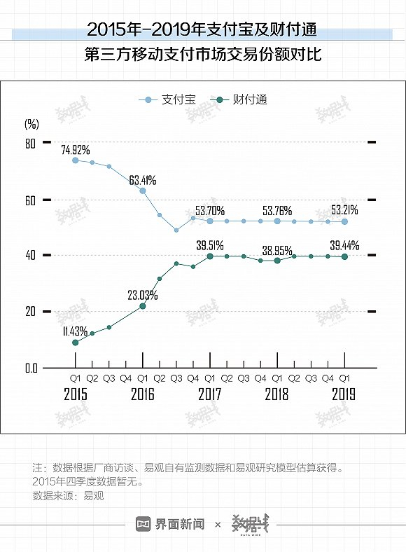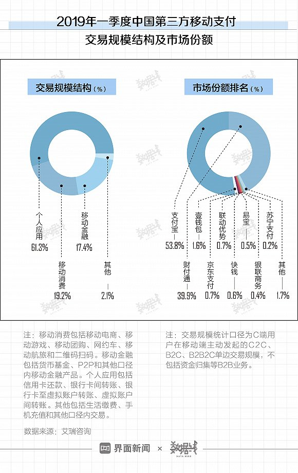 另一家大数据机构易观发布的2019年一季度数据亦显示,支付宝和腾讯金融在一季度的中国第三方移动支付市场上依然处于领先地位。据易观数据,支付宝和腾讯分别占据了53.21%和39.44%的市场份额。