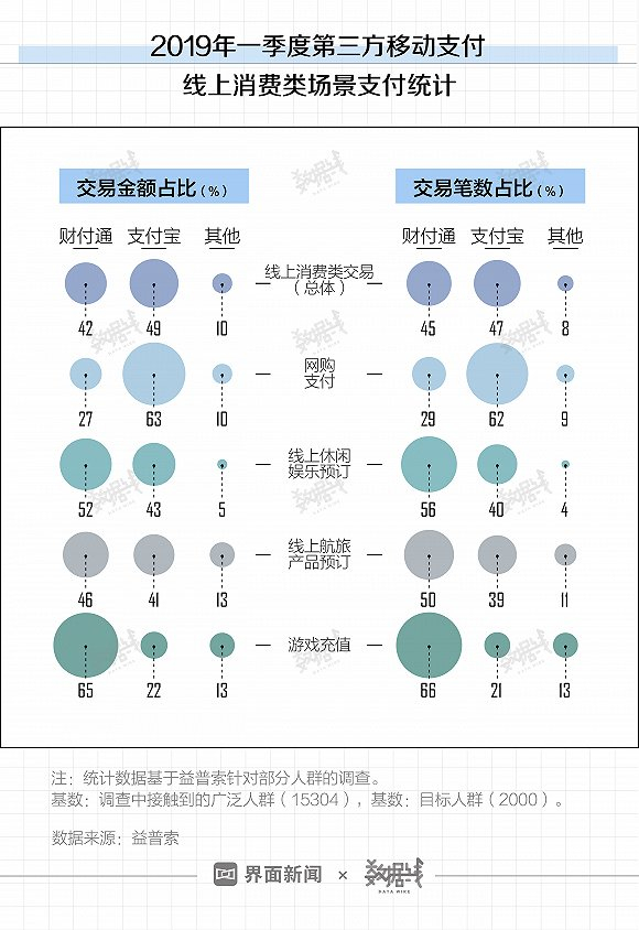 线上消费类场景方面,两大巨头各自守住主营业务阵地。支付宝在网购支付方面优势巨大,财付通则在游戏充值领域保持领先。
