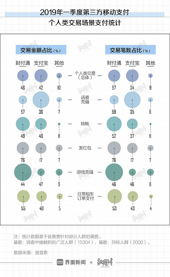 个人类交易场景方面,得益于转账、发红包等强社交属性领域的优势,财付通的交易金额和笔数稍稍领先支付宝。