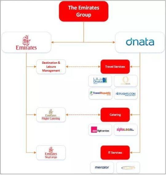 阿联酋航空集团旗下有很多子公司,其中以 Dnata 航空服务公司和阿联酋航空最为出名。