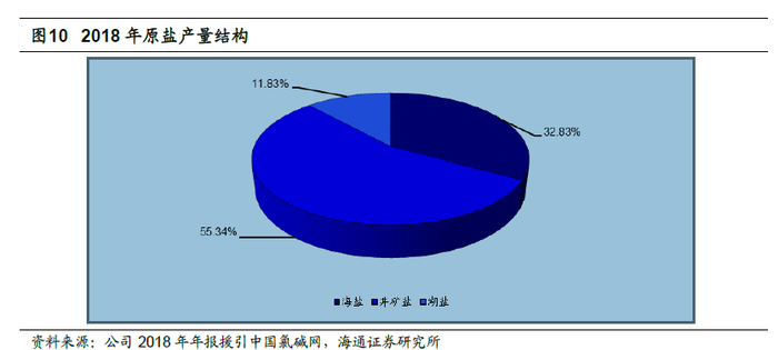 原盐产量稳定提高,井矿盐产量有望进一步上升。根据公司2018 年年报,2018年全国累计产盐9153 万吨,同比增加2.72%,其中,井矿盐5065 万吨,同比增长8.76%;海盐3005 万吨,同比下降3.96%;湖盐1083 万吨,同比下降3.73%。同时,河北中盐龙祥盐化有限公司60 万吨真空制盐项目、榆能集团佳县盐化有限公司60 万吨真空制盐项目相继开车,中国平煤神马集团联合盐化有限公司新锅炉投入生产。我们认为,随着井矿盐产能持续增长,井矿盐的产量也将进一步增加。