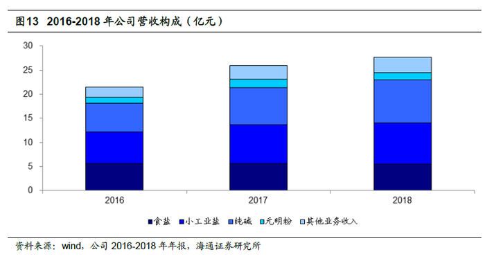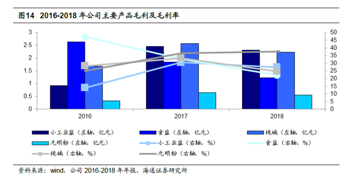 盐及盐化工产品是公司主要盈利来源。目前,盐及盐化工是公司的主导产品,根据公司2018 年年报,当年公司共实现毛利7.41 亿元,其中食盐、小工业盐、纯碱、元明粉分别实现毛利1.23 亿元、2.32 亿元、2.23 亿元、0.55 亿元。食盐、小工业盐、纯碱合计毛利占比为78.02%,为主要收入来源。