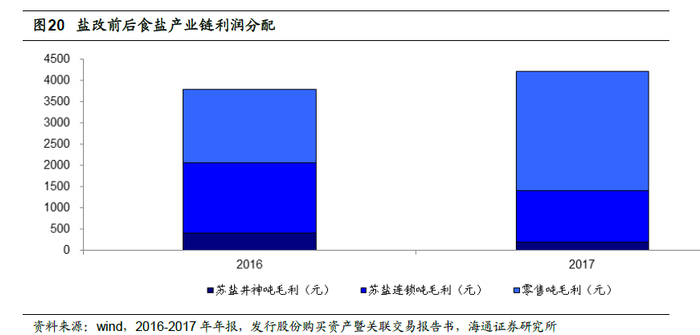 盐改重塑食盐产业链利润分配。盐改初期,盐业公司主要通过低价策略抢占食盐市场,生产和批发环节的整体利润水平有所下降。我们认为,在食盐零售端,产品价格稳中有涨,零售环节利润水平大幅提升。根据我们测算,2016 年食盐产业链吨毛利共3798.49 元,苏盐井神(生产)、苏盐连锁(批发)和零售环节吨毛利分别为399.23 元、1670.68 元、1728.58 元,毛利率分别47.21%、66.39%、40.72%。盐改后,2017 年食盐产业链吨毛利共4225.32 元,苏盐井神(生产)、苏盐连锁(批发)和零售环节吨毛利分别为203.25 元、1214.97 元、2807.11 元,毛利率分别为32.80%、66.22%、60.48%,生产批发端利润水平下降,产业利润向终端转移。