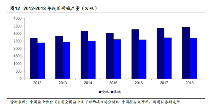 两碱行业是制盐行业的主要下游行业,需求总体稳定。原盐是两碱工业的基础原材料,近年来两碱用盐占全国盐总消费量的70%以上。我国已形成以纯碱行业和氯碱行业为龙头、下游产品快速发展的盐化工产业格局。根据中国报告大厅网的数据,2018 年1-12 月全国烧碱产量为3420.2 万吨,累计增长0.9%,纯碱产量累计达到2699 万吨,同比下降1%,两碱产量总体稳定。