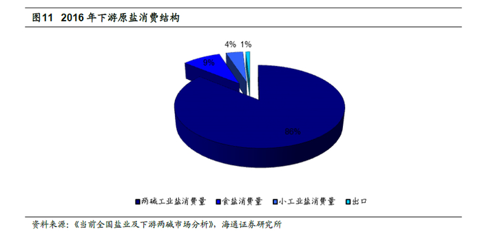 两碱工业盐是原盐消费量的主要消费量,占原盐消费量的85%以上。根据中国盐业协会发布的《当前全国盐业及下游两碱市场分析》,2017 年中国原盐消费量10021 万吨,同比增加4.1%,其中两碱工业盐消费量8565 万吨,同比增加 3.8%;食用盐和小工业盐消费1322 万吨,同比增加3.8%;出口134 万吨,同比增加11%。