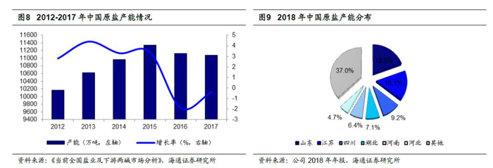 原盐总体产能趋于稳定,山东、江苏是主产区。根据中国盐业协会2018 年发布的《当前全国盐业及下游两碱市场分析》数据显示, 2017 年我国原盐产能达到11075 万吨,较2016 年同比减少0.4%,原盐产能总体趋于稳定。根据公司2018年年报,中国原盐产能的地区分布中,山东、江苏两省分别占总体产能的19.5%和16.1%,是中国原盐的主要产区。