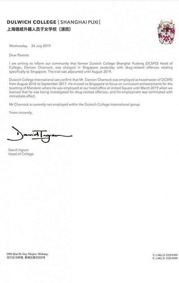 7月24日,上海德威外籍人员子女学校浦西校区校长戴维·英格拉姆(David Ingram)就此事向学生家长发表公开信称,米安·查诺克确在新加坡受到吸毒指控,审判将延期至2019年8月举行。