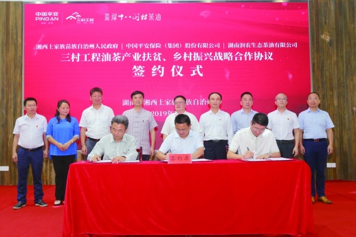 7月25日,中国平安与湘西土家族苗族自治州人民政府、湖南润农生态茶油有限公司在花垣县十八洞村签订战略合作协议,通过带动当地30万亩油茶示范基地建设,打造油茶特色产业扶贫闭环。中国平安还同步推进教育扶贫、健康扶贫,为湘西“造血式”脱贫贡献力量。