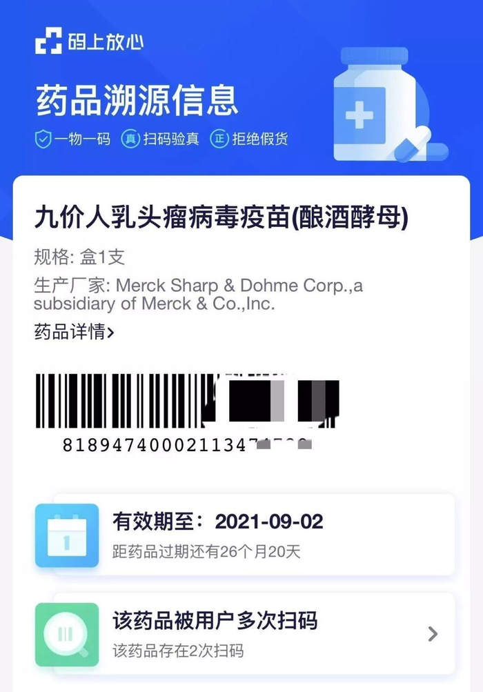 疫苗专家陶黎纳表示,专供中国内地的宫颈癌九价疫苗分为10支一盒和单支一盒两种规格,外包装上的名称均改成了“九价人乳头瘤病毒疫苗(酿酒酵母)”的简体中文,包装盒的背面则贴有20位的药品追溯码,每支疫苗的追溯码均不同,无法造假。消费者只需通过手机支付宝App扫码就能查询药品溯源信息。