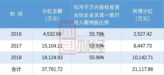根据历年分红数据以及股东持股比例,2016年至2018年公司共分红约3.78亿元,石河子万兴股权投资合伙企业及其一致行动人累计所得分红约2.11亿元。
