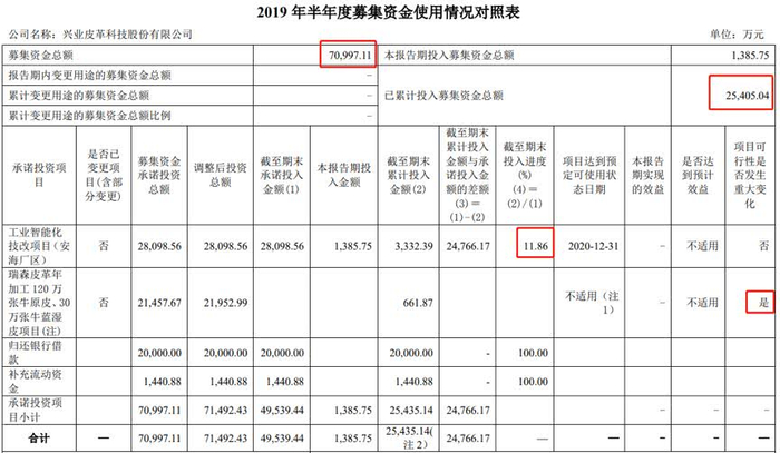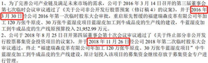 具体查看募集资金使用情况对照表可发现,承诺投资项目中的瑞森皮革项目因下游需求疲软而于2018年11月经股东大会通过终止。自项目重启之日到终止之时,已有两年多的时间,公司对该项目累计投入661.87万元,投入进度仅仅为3%。