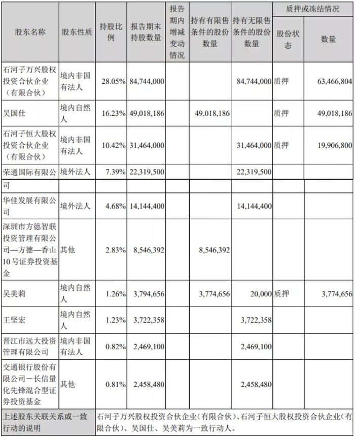 根据2018年年报信息披露,在公司前十大股东中,石河子万兴股权投资合伙企业、石河子恒大股权投资合伙企业、吴国仕、吴美莉为一致行动人,合计持股比例55.96%。